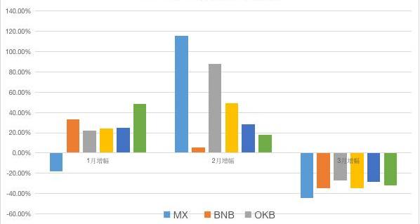 六家平台币在不同的月份表现各异,其中ZB和BNB在1月表现强劲,增幅分别是48.1%、33.1%;MX与OKB在2月表现亮眼,增幅分别是115%、87%;但到了3月,MX后势不足,跌幅领先,OKB跌幅最小,只有27%。