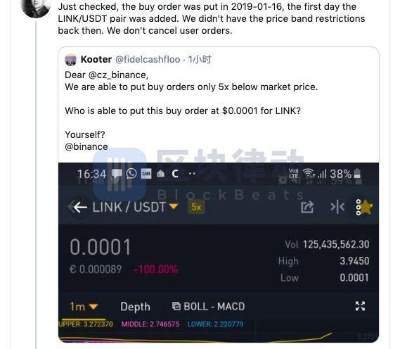 推特网友随后就此事向赵长鹏提问,后者的回复让人大吃一惊,原来有人早在币安刚刚上线LINK交易对,即去年1月16日当天,开放实时交易后的8秒内挂了一个低价单,但一直都没有成交,因为没有傻子会按这个价格卖掉。