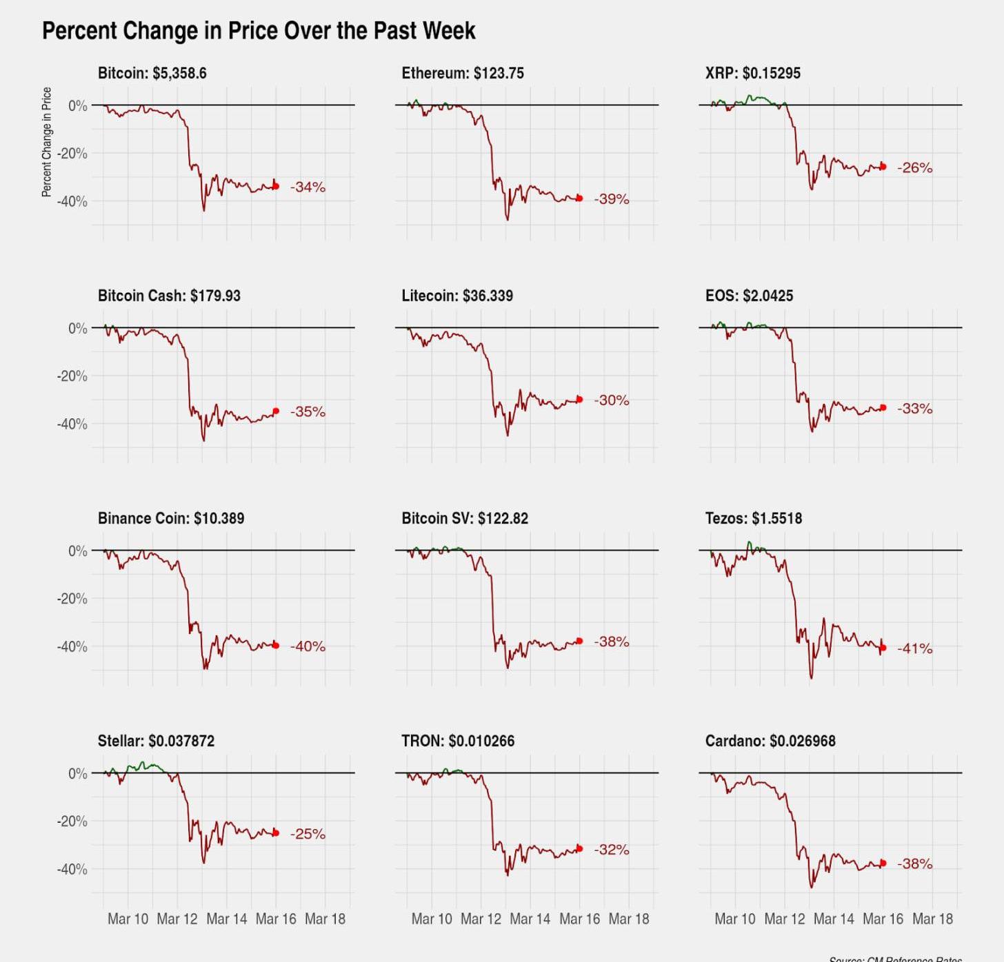 3月12日,由于对新冠肺炎快速蔓延造成的恐慌情绪,比特币出现了单日价格大幅下跌,其余加密货币普遍跟跌,大多数加密货币周跌幅超过30%。