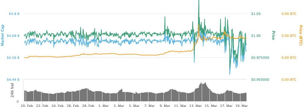 据USDT市价走势图可知,虽说USDT号称其与美元保持1:1的稳定兑换比例,但是在加密市场上,USDT的市价一直都处于波动状态。