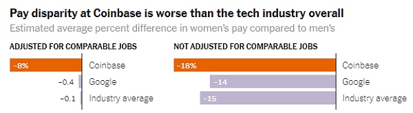 等到离职风波渐渐平息,去年 12 月,《纽约时报》发文直指 Coinbase 内部并不「安定」。通过走访调查与统计,作者发现 Coinbase 的薪酬差距比整个科技行业要大得多,部分员工或因种族和性别受到了不公平对待。