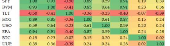 我们发现,只需将投资组合的资产分配集中在BTC,SPY,USO和TLT上,就可以轻松构建多元化的投资组合。由于所有这些资产本质上都是美元敞口,因此在组合中添加UUP只会增加美元敞口。SPY与IWM和EFA的关联度很高,这表明无论哪种ETF的增加都会增加我们对股票的潜在敞口而TLT与HYG之间有着明显的价格关系。