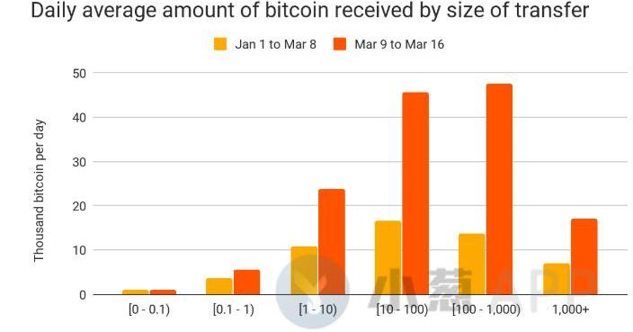 自3月9日以来,通过小额转账进出交易所的比特币数量几乎翻了一番。这表明买卖双方都大量参与了“零售”业务。不过,值得注意的是,单笔转账介于10到1,000比特币之间的比特币数量占据70%,这一比例略高于平时水平。另外,单笔转账超过1000枚以上的比特币数量占据10%。