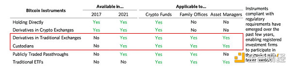 对于大型机构而言,要在其投资组合中持有比特币,还需要拥有足够的流动性,以便在不破坏市场稳定的情况下进行规模较大的交易。在这一点上,尽管比特币正变得可以与桥水基金在某些市场交易进行比较,但其流动性已经达到历史最高水平,所以你可以看到这一市场规模目前仍然很小。我们会在下面总结一些投资工具比较,根据我们对流动性的评估: