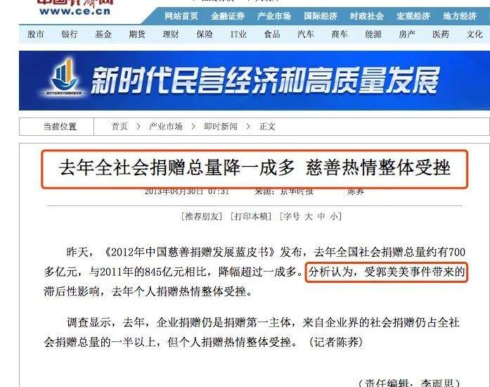 「不信任」影响多严重?我们通过2011年「郭**事件」发生后的各类数据进行说明。根据《2011年度中国慈善捐助报告》核心数据。受郭美美影响最严重的机构,该体系2011年接收社会捐赠约28.67亿元,比2010年减少59%左右。与该机构的受捐骤降形成对比,2011年,我国社会捐赠总量共计约845亿元,捐赠总量较2010年下降18.1%。该事件形成的连锁反应并未终止,继续看2012年。《2012年中国慈善捐赠发展蓝皮书》,全国社会捐赠总量约有700多亿元,与2011年的845亿元相比,降幅17%左右。观察这个最受影响的机构总会的公开年度审计报告数据,数字能说明一切。捐赠收入如下: