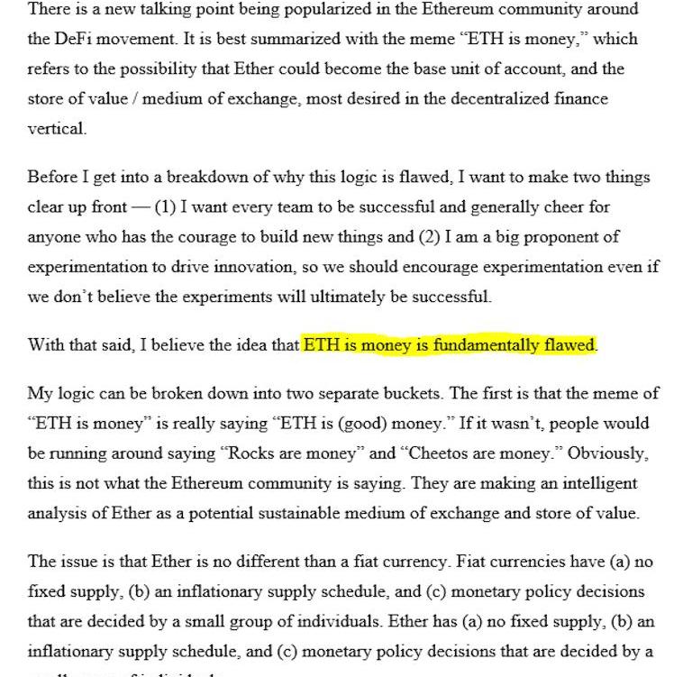 Pompliano的时事通讯不同意“以太坊就是货币”的概念