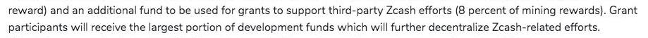 开发资金将分配给ECC,Zcash基金会和一笔用于支持第三方Zcash业务而予以赠款的额外基金。赠款参与者将获得最大比例的开发资金,这将进一步分散与Zcash相关的业务。还引入了有关每个参与者的正式问责制和报告要求的规定。