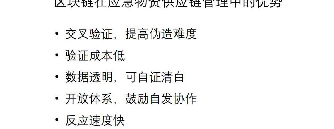 整个这套体系跨了多个国家,转了大半个地球,还是保持了一个很好的可信度。这套体系如果部署来做我们的应急物资管理,我认为是足够的。区块链在做应急物资管理中有很多的优势:
