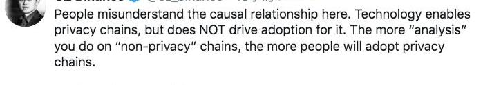 人们误解了这里的因果关系。技术使隐私区块链成为可能,但不会推动其普及。你对“非隐私”区块链进行的“分析”越多,采用隐私链的人就越多。