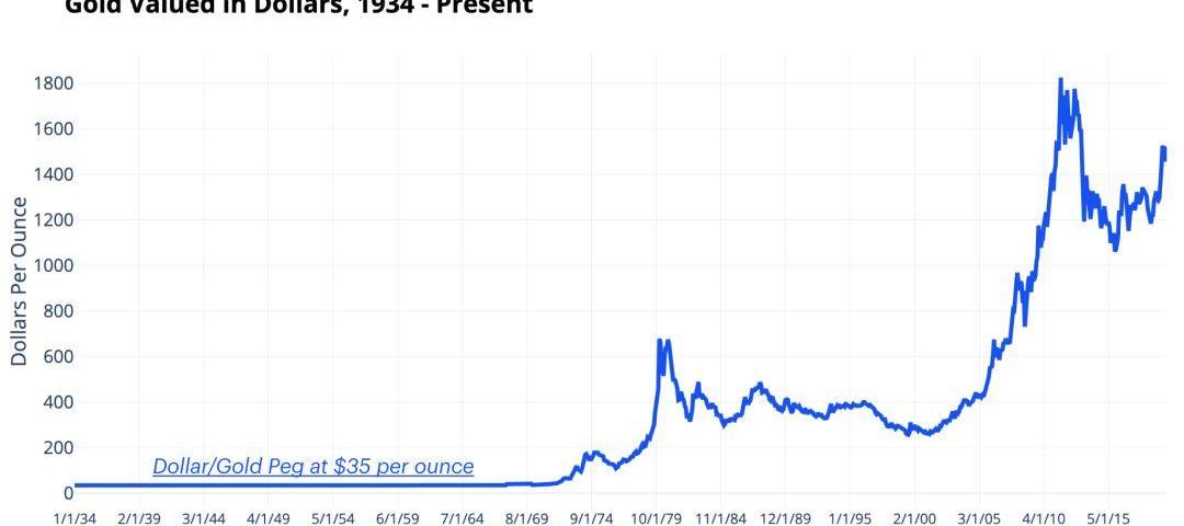 黄金稀缺,政府无法简单地生产更多黄金来满足目标。因此,1971年美国放弃了金本位制,美元成为与黄金不直接挂钩的法定货币。从那以后,美元贬值,黄金从每盎司35美元的固定价格上涨到今天的1500多美元。