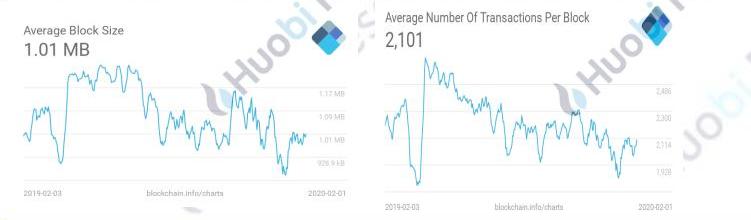 本周比特币区块平均大小上涨、区块平均交易次数上涨。根据blockchain.info数据计算,2020年1月27日至2020年2月2日,比特币本周每个区块的平均大小为1.01MB,环比上涨1.69%,每个区块的平均交易次数为2101次,环比上涨1.84%。