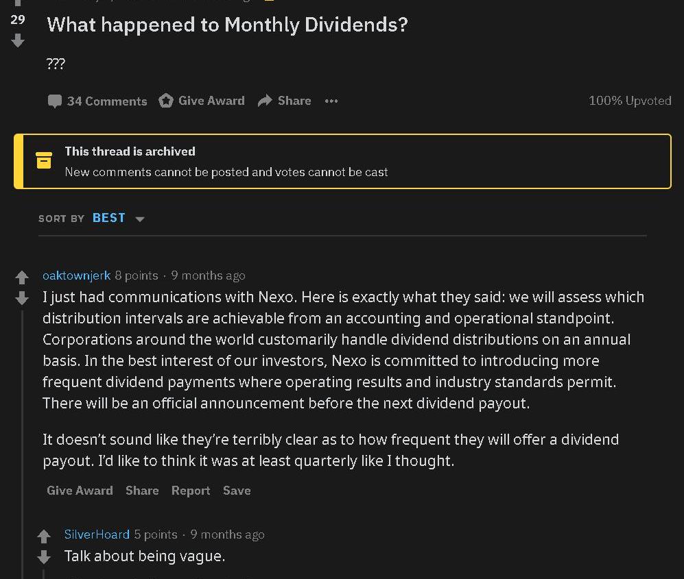 NEXO最喜欢给出含糊的答案。如果一家公司应该根据利润支付分红,他们应该发布关于公司运作的定期报表。问题在于,NEXO和Credissimo都是私人实体,除了来自NEXO持有者的压力外,他们没有义务公开自己的收益。