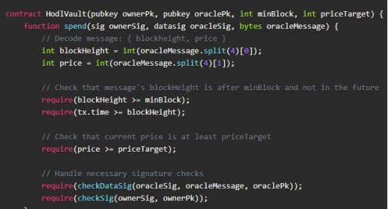可以在下面的HODLVault示例合同中查看此示例。该合同强制执行HODLing,直到达到一定的BCH/USD价格为止。所需的BCH/USD价格供稿由oracle提供程序发布,并由用户传递到合同中。为了增加分散性,可以将智能合约设置为使用多个数据源,而不是信任单个集中式服务。