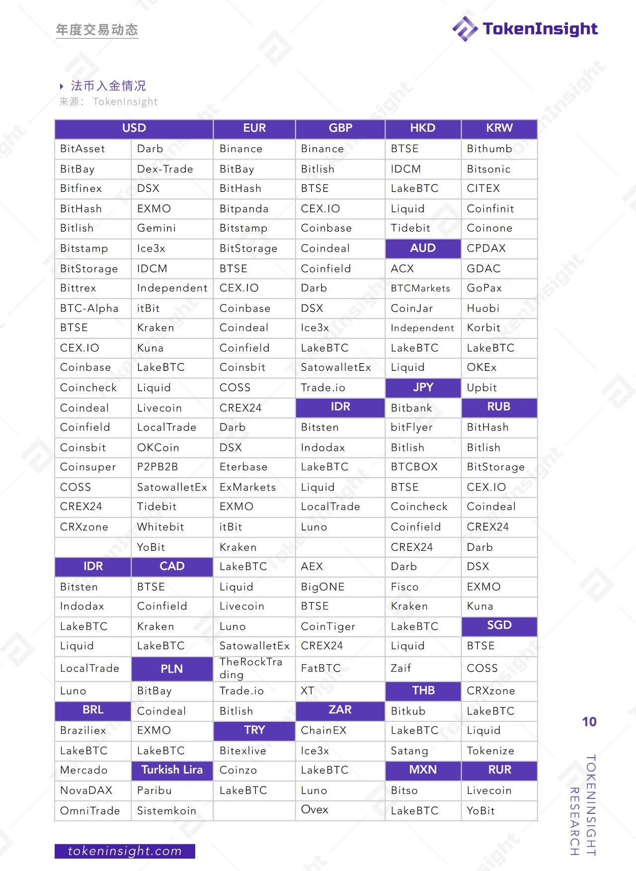 11.交易所行业的布局针对美国和欧洲地区;各类法币在细分市场交易所也均有入金通道,数字资产配置门槛在2019年大幅度降低。