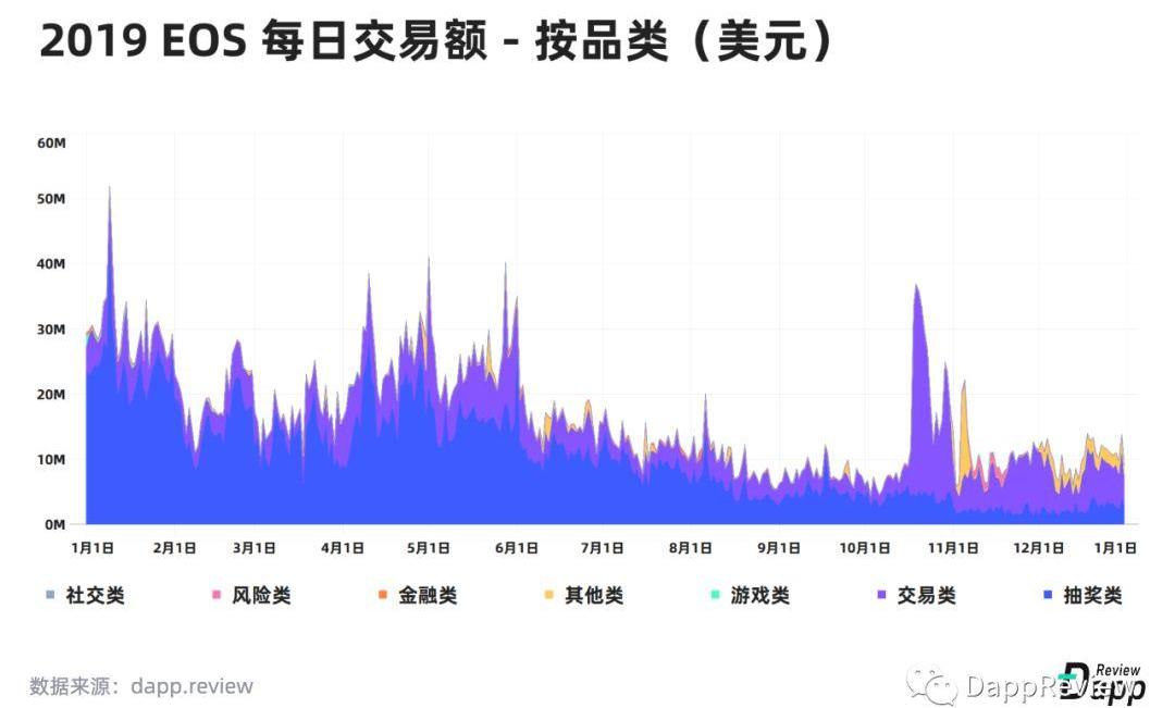 从交易额来看,抽奖类Dapp在上半年是EOS的主力,下半年呈现下降的态势,全年占比64.6%。与波场生态类似,这些抽奖类Dapp大多有自己的分红型代币,这也带动了头部去中心化交易所WhaleEx和Newdex的交易量,该板块占比32.1%。