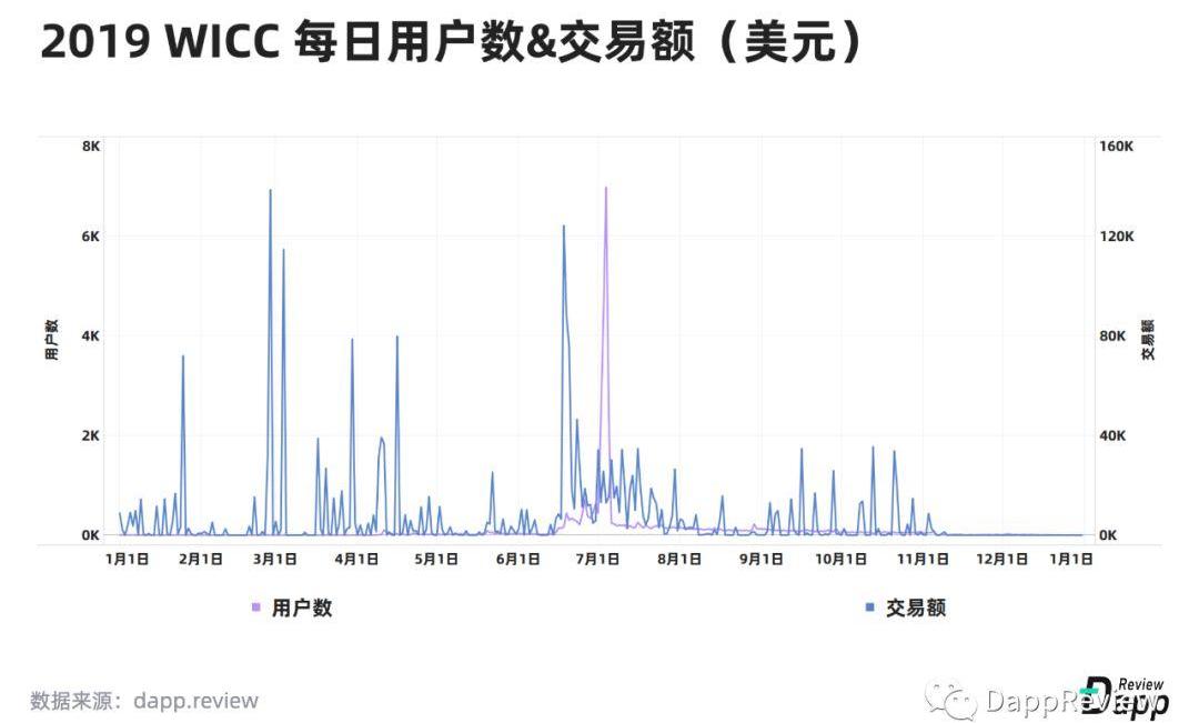 维基链已上线20款Dapp,以游戏类和抽奖类为主。不过真正对全年交易额走势有影响的是一款名为“锁仓”的Dapp。这款Dapp由维基链官方开发,维基链投资者可以将自己的Wicc锁仓,分享收益。去年7月份,抽奖类Dapp“宝石争霸”的上线为整个生态带来了些许活力,活跃用户数一度突破6,000。