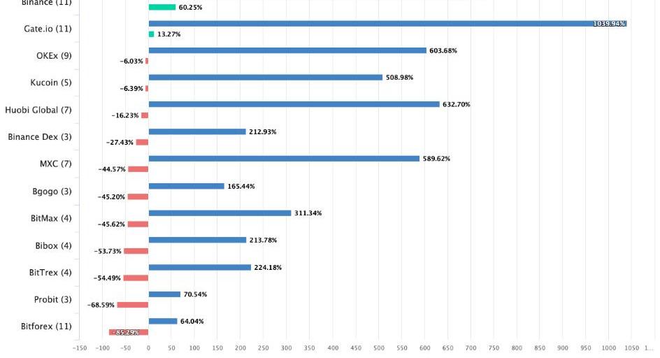 交易所之间和同一交易所的各IEO项目之间的回报率差异巨大,反映出整个市场的资金轮动和流动性不足状况,交易所之间和交易所的IEO项目间出现了明显的资金争夺。加密资产交易所分化日益加深,参与头部交易所IEO的平均回报率大幅度超过尾部交易所。