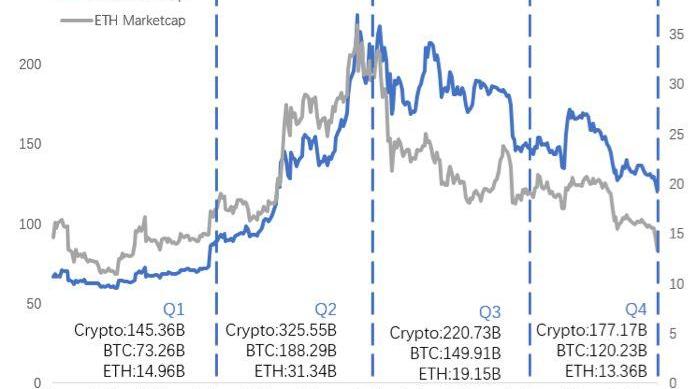 第四季度由于国内发展区块链行业的政策,促使加密货币市场实现较大反弹,但总体仍处于下跌趋势之中,各类加密资产在短暂反弹后继续下跌,除比特币以外的大部分币种市值在近期已重回年初水平。