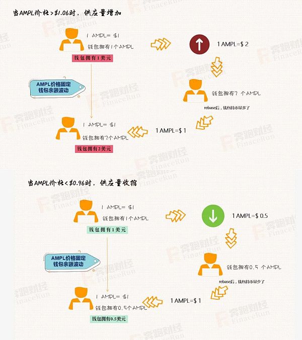 当AMPL价格低于0.96美元,供应量收缩,当AMPL价格高于1.06美元,供应量增加。AMPL使得每个持币钱包在代币供应变化后钱包持币量都会发生一定比例的变化。
