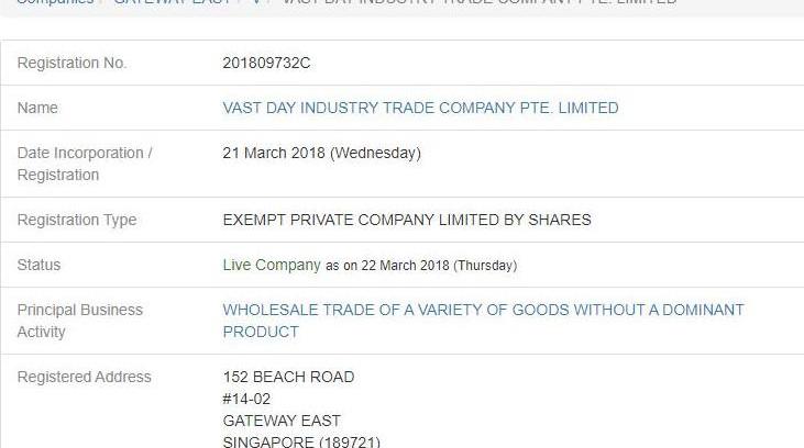 记者进一步查询海外工商注册信息网站发现,这位豪掷亿元的VAST客户注册地在新加坡,属于无主营产品的贸易公司,注册时间就在2018年3月21日,即浙江亿邦披露的10万台矿机合同实际签署日期。