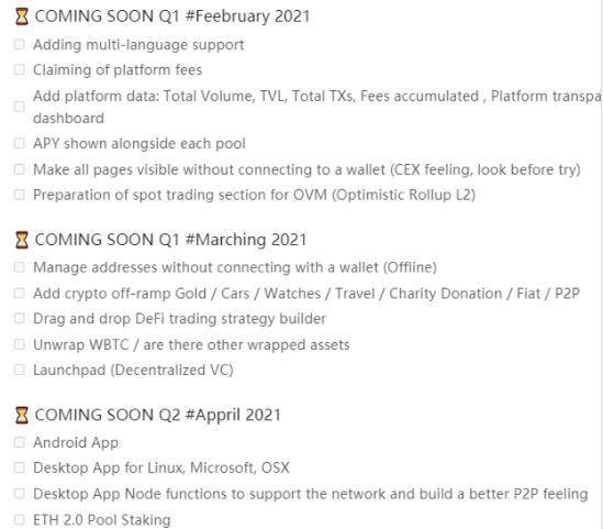 3 月份,OctoFi 将支持在不连接钱包的情况下管理地址,4 月份将发布安卓应用、以及适用于 Linux、Microsoft 和 OSX 的桌面应用并支持以太坊 2.0 质押,5 月份将优化 Gas 交易成本以及托管 OTC 链上兑换解决方案,四季度构建一个能汇集多个 DeFi 预言机数据的预言机聚合器,12 月份添加 NFT 交易界面和发布全新的 2.0 前端。