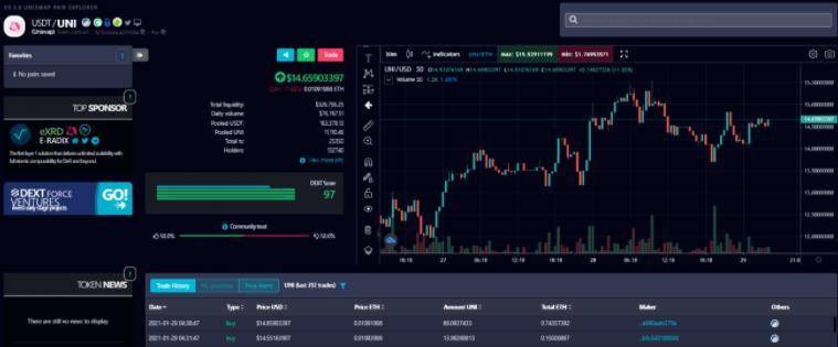 DEXTools 既是 DEX 的「信息百宝箱」,也集成了交易机器人。DEXTools 的目标是将去中心化交易所 IDEX 和 Uniswap 甚至所有 API 和区块链提供的数据信息以最为直观的形式实时展示给用户,包括 DEX 上代币的上线以及资金池的创建和移除动态、资金池的流动性数据以及钱包查询等,也提供代币购买和流动性提供入口,从而帮助交易者提升交易效率,作出更优决策。