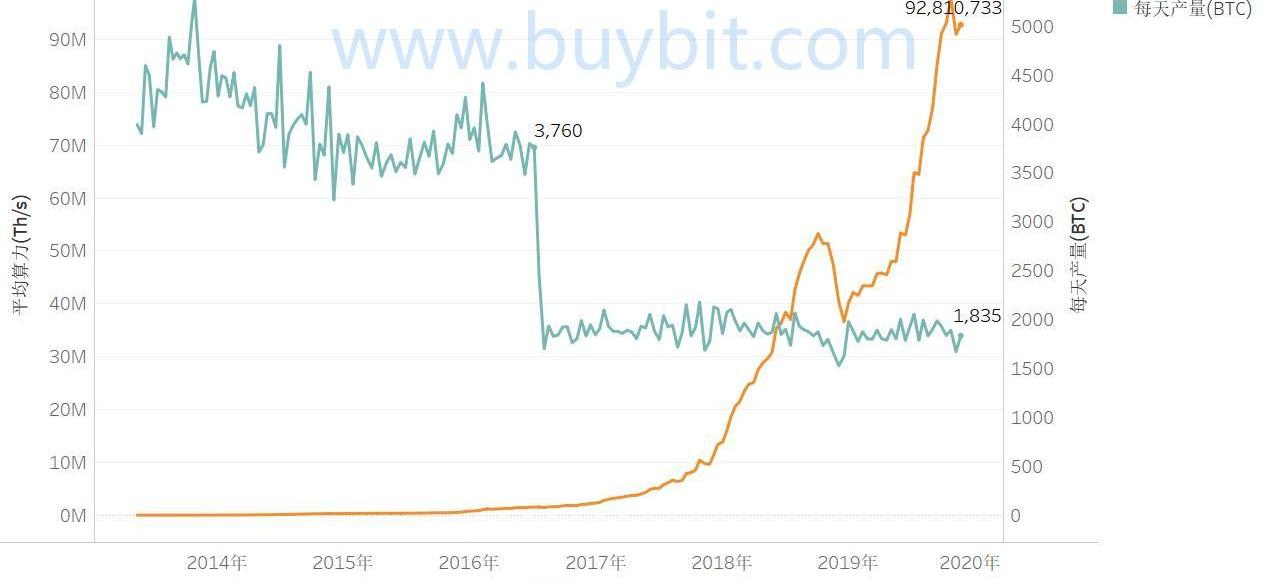 下图摘自文献,形象地展示了每天的比特币产量与全网平均算力: