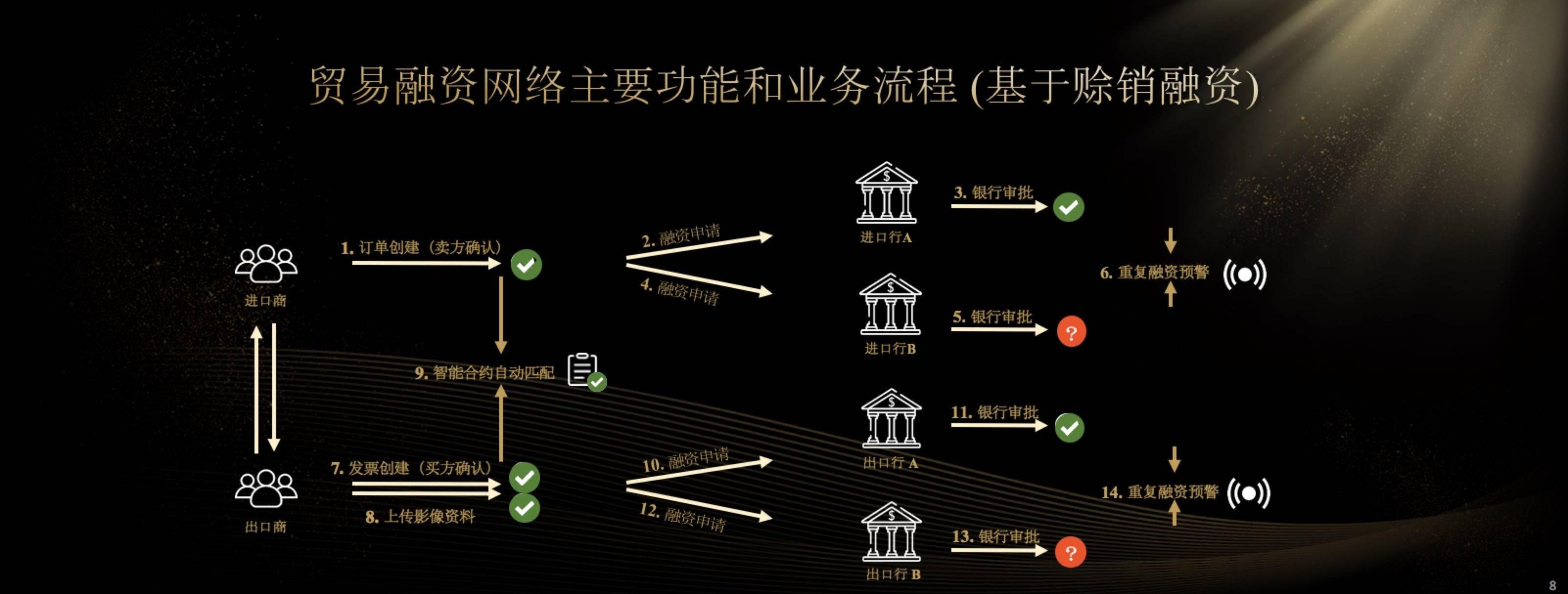 再讲一个进出口贸易金融的案例。进口商是在银行A创建订单,出口商在银行B校验这个订单,这是在香港和其他地方贸融网络中普遍存在的交叉应用的订单。依照我刚才讲的流程,企业到两个银行融资,通过区块链网络,我们可以让出口商在银行B平台创建的发票能跟进口商在银行A创建的发票进行交叉匹配的认证,跨平台的数据对比。企业去银行A融资,再去银行B融资,会进行重复融资的预警和检测。