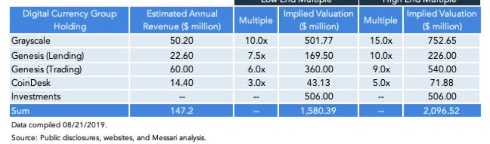 DCG旗下还有媒体平台Coindesk。过去几年间,该网站以数字资产新闻的主要来源这一标签而为人熟知。其大部分收入主要来源于主办的年度共识会议。据报道,去年CoinDesk收入为2500万美金,其中85%是来自共识大会。去年约有一半时间去参加共识会议,因此这50%的部分带来了约1430万美金的收入。我们没有找到一个与之拥有类似商业模式的上市公司。幸运的是,据报道,一家叫做Money2020的领先金融科技媒体公司几年前售价就高达1.2亿美金。我们查看了出席人数和不同定价的分类,推断出预期收入为3420万美金,为活动收入的3.7倍。若以3-5倍的收入倍数来计算,CoinDesk估值处于4310-7190万美金之间。这一结果和2019年5月CoinDesk被传以7000万美金出售的传言相符。