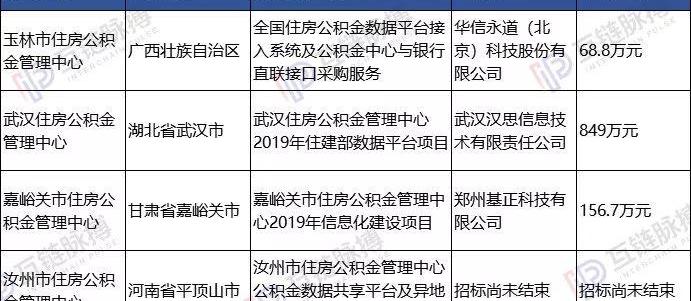 广西壮族自治区玉林市、湖北省武汉市、甘肃省嘉峪关市、河南省平顶山市多地均开展了围绕住房公积金的政务应用的招标。该类项目,多是旨在完成公积金平台与区块链平台的对接,进行数据传输、数据校验、运用区块链技术保障数据安全性和一致性。