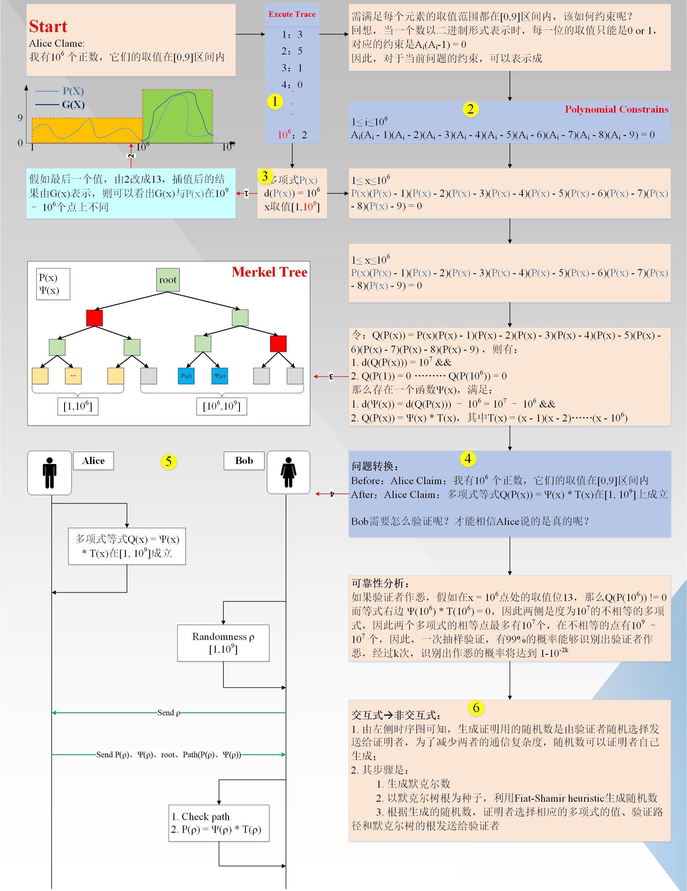 AliceClaim:“我有1000,000个数,他们都在范围内”。为了方便验证者Bob验证,Alice首先要对Claim进行Arithmetization转换。过程如下图1所示(图中:黑色箭头代表主流程,红色箭头代表附加说明信息,黄色圈对应下面详细说明的索引)