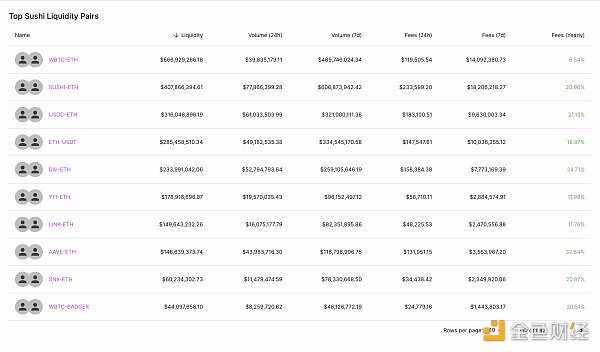 从1月份以来,sushiswap的交易量一直保持在单日30亿美金左右。目前没有单日收入的总数据,只能从交易对排名里看到单个交易对的统计,数据如下图,可以看到24小时和7日内的手续费收入很高。