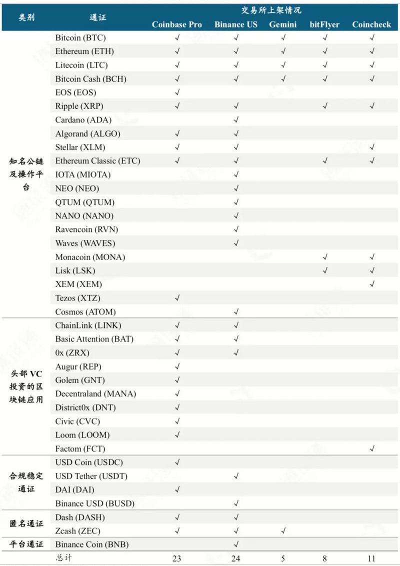 3)合规稳定通证。Coinbase仅上架合规中心化稳定通证USDC与去中心化稳定通证DAI,BinanceUS上架USDT、BUSD。