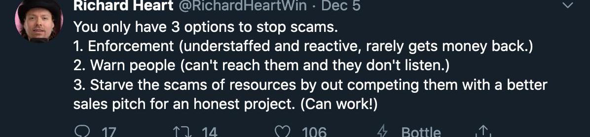 即使你相信Richard,不认为他会做这些事,这说明了Richard的力量,摧毁了已经破碎的博弈论。通过参与HEX,你不仅让RichardHeart越来越富有,你还完全任他摆布。他创造了一个游戏,给了自己大部分筹码,让规则永远对他有利。这是一场你赢不了的比赛。即使看起来你能做到,Richard也会告诉你坚持就是胜利。但事实上你不能。如果你买了HEX,你就在经济上蒙受了损失。如果你通过比特币免费获得HEX,你就失去了诚信,因为你正在认可一个子。