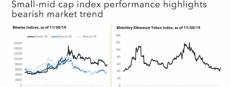 中小型市值资产的市场趋势是下跌,上图左侧分别对比了Bitwise10、Bitwise20、Bitwise70的走势;右侧则是BletchleyEthereumToken指数,在第1和第3季度表现较为强劲,但第4季度正在衰退。