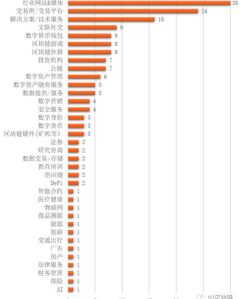 从二级行业融资数量分布情况看,行业网站&媒体、交易所/交易平台和解决方案/技术服务商最受资本方青睐。