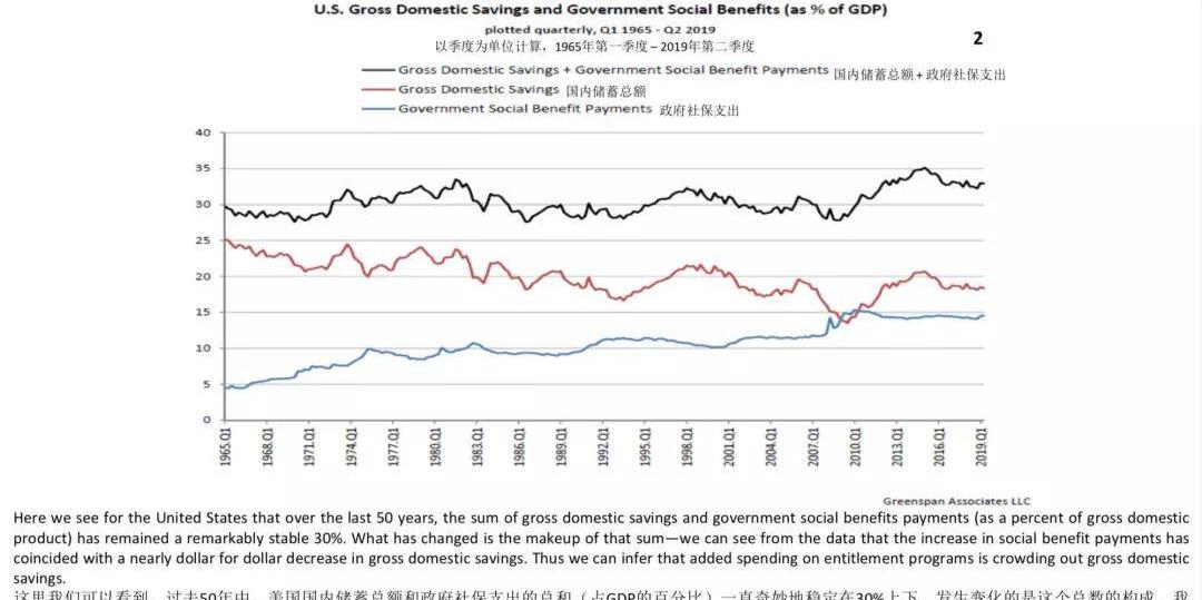 因为人口老龄化,美国、英国等社会福利支出出现显著增长,福利的支出挤占了国内储蓄总额的空间,进而挤出了国内投资总额,后者正是生产力增长的主要决定性因素。