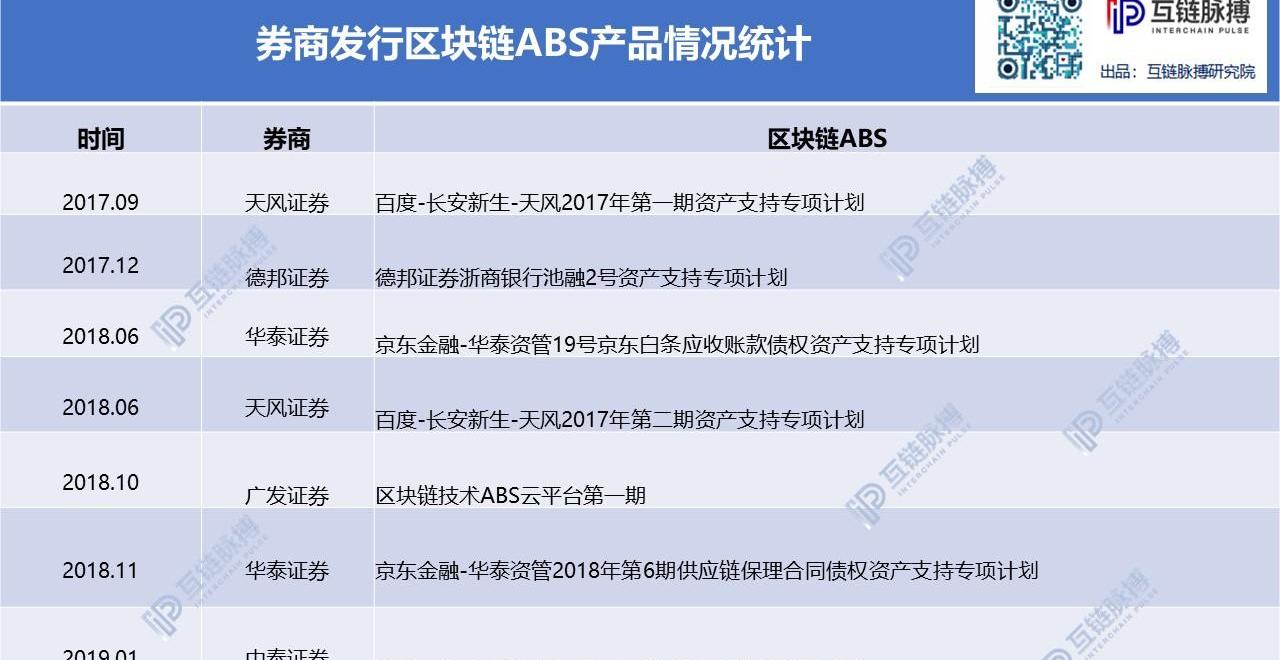 自2017年9月以来,天风证券、德邦证券、广发证券、华泰证券等便已陆续推出相关产品,据互链脉搏统计,目前市场上至少有7单区块链ABS产品。