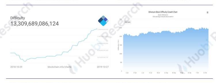 比特币本周挖矿难度上升、以太坊挖矿难度环比下降。截止10月27日,比特币本周挖矿难度保持在13.309T,比上周环比上升2.31%。以太坊本周全网平均挖矿难度为2480.646T,环比下降2.59%。