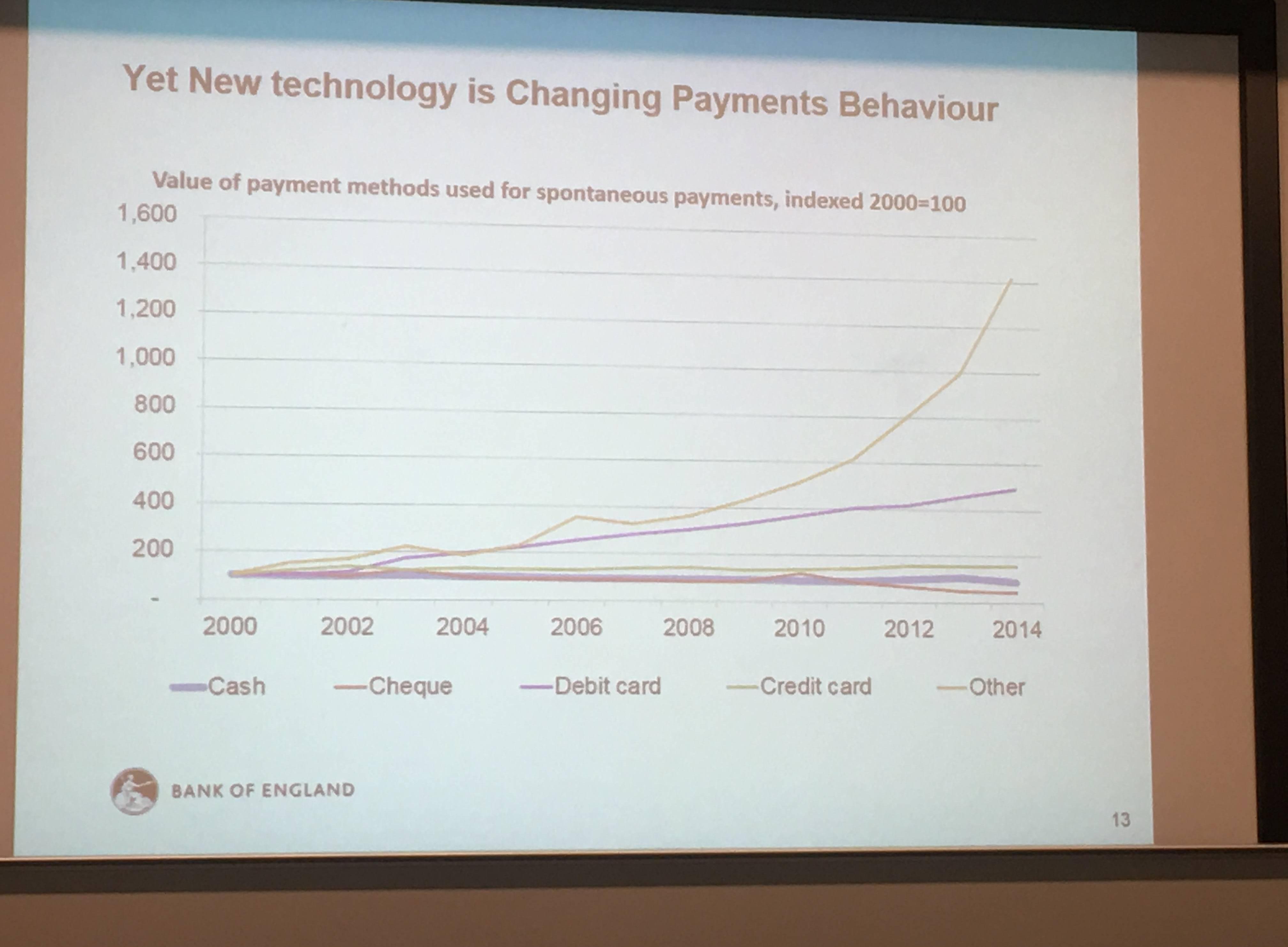 Onecouldarguethat,BankofEnglandnoteswereaheadoftheirtime.Theyhavealwaysofferedaverywidelyaccepted,fullydistributed,peer-to-peerpaymentmechanism.Andbanknotesprovidefullandfinalinstantaneoussettlementincentralbankmoney.Thesebanknotesarestillakeypaymentmethodtodayandaccountedforaroundhalfofconsumerpaymentsin2015,witharound2.2mnUKcitizensrelyingalmostexclusivelyoncashforeverydaytransactions.Andwithdemandexpectedtoremainstrong,itisimportantthatbanknotestoobenefitfromthestateofthearttechnology.Indeedwelookforwardtolaunchingourfirstpolymerbanknote–the£5featuringSirWinstonChurchill,nextweek,on13September.有人可能会说,英格兰银行的票据在以前就领先世界。他们一直提供了一种广泛接受的、完全分布式的点对点支付机制。钞票可以提供中央银行全部和最终的即时结算。这些钞票仍然是当今的主要付款方式,在2015年约占消费者付款的一半,约有220万英国公民几乎完全依靠现金进行日常交易,并且由于需求预计将保持强劲,因此重要的是,钞票也应从中受益,使用了最先进的技术。的确,我们期待着下周9月13日推出我们的第一张聚合物钞票--温斯顿·丘吉尔爵士的5英镑钞票。