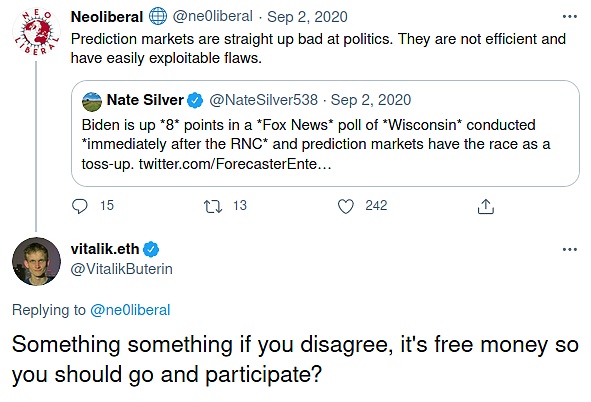 我的Twitter朋友对此的主要回应是,基于区块链的市场是非常利基的,参与者很少,特别是很少有人对有太多的了解。这似乎有道理,但我对这一论点不太有信心。所以当时我2000美元特朗普会输,但没有进一步下注。