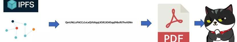 假设大白想要上传一个PDF文档到IPFS系统中,第一步大白需要将PDF文档添加到IPFS客户端中。IPFS客户端会将这个PDF进行哈希云算,并给出一个以Qm开头的哈希值。IPFS的一个特点是基于内容的地址来替代传统互联网基于域名的地址。