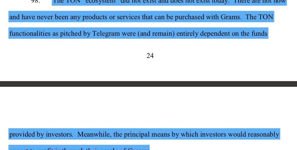 AvichalGarg在推文中,标注的SEC文件内容是第98条:「TON「生态系统」过去并不存在,现在也不存在。过去直到目前都没有任何能够使用Grams购买的产品和服务。由Telegram决定的TON的功能,目前完全独立于投资者所有提供的资金。同时,站在投资者角度,委托人有理由期望通过Grams的再销售来获得利润」。