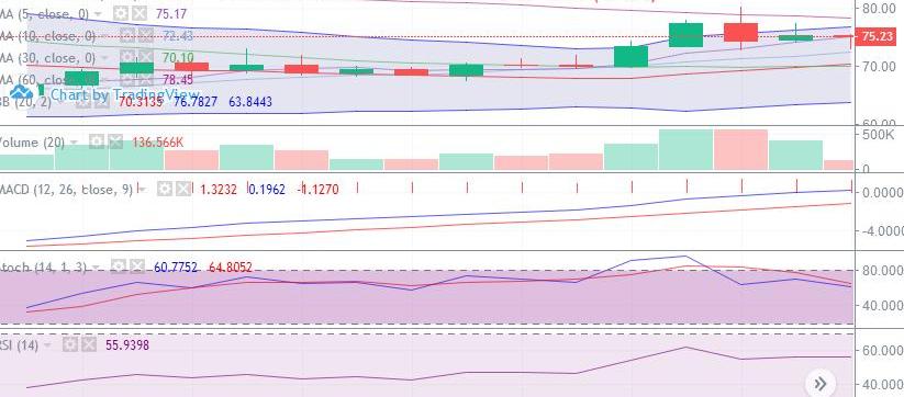 LTC深入回调向下试探10日均线后反弹至5日均线附近调整,当前走势围绕着75一线运行,整体走势呈被压制姿态运行,上方空头压力较强,市场动能缺乏,后续走势将进入震荡下行的趋势中,而短期走势反弹力度逐渐增强,不断释放上方压力,之后走势也将会以震荡的节奏为主,操作建议高空低多,关注上方阻力78-80位置,下方下方花之城72-70位置。