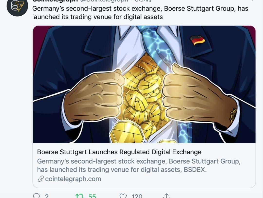 1、据Cointelegraph报道,德国第二大股票交易所斯图加特集团,刚推出它的加密货币交易所。