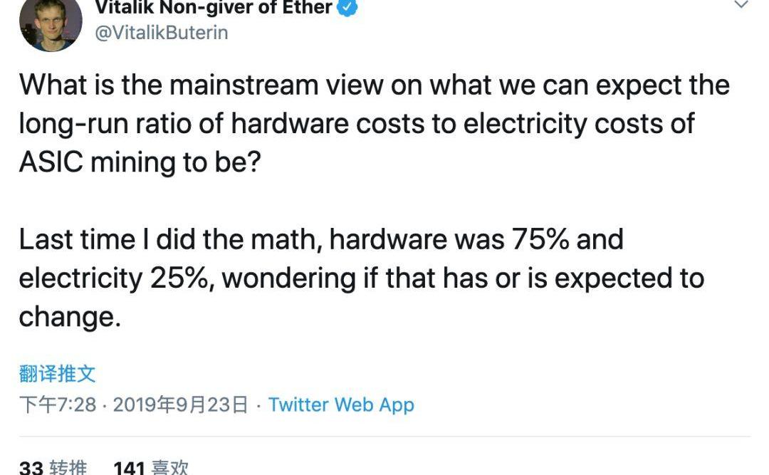 ASIC挖矿的硬件成本与电费的长期比率,主流观点是什么样的?