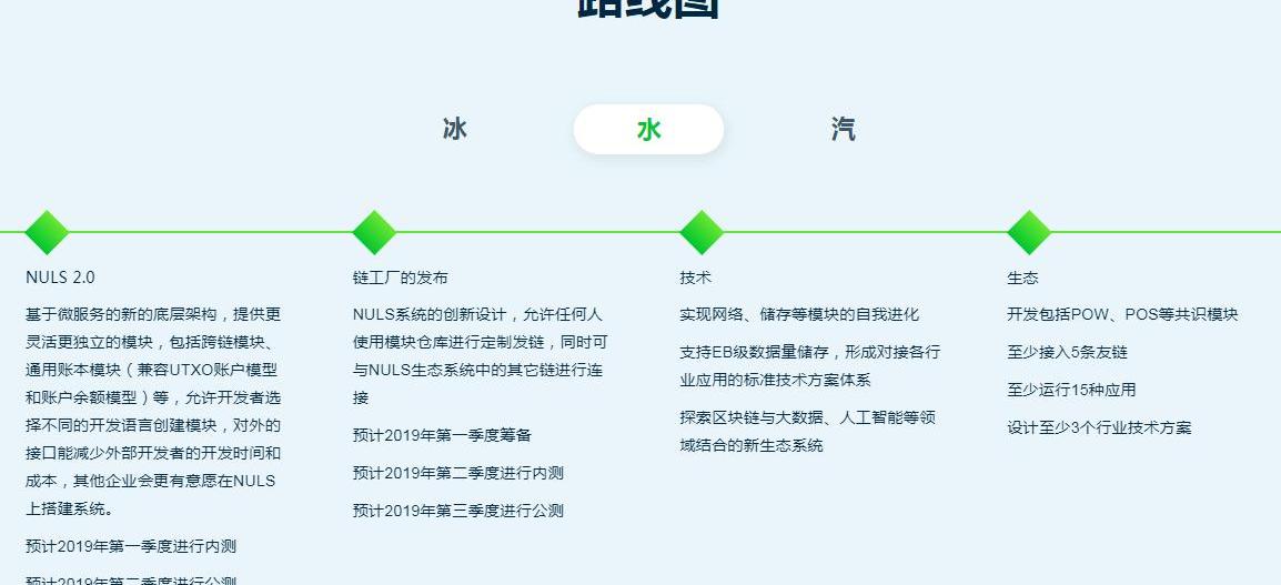 项目简介:纳世链是一个面向定制化服务的区块链基础设施,一个全球化的开源社区项目。NULS采用微服务思想,实现高度模块化的底层架构,运用模块仓库、智能合约和跨链等技术,同时结合链工厂快速搭链的能力,降低区块链开发成本,推动区块链商业应用落地。NULS提出模块化思维与多链并行的微服务架构,秉承以“链”为核心的发展理念,打造核心产品“链工厂”。基于NULS,用户可以灵活选择网络模块、共识模块、存储模块、账本模块、智能合约等核心功能模块创建NULS链网中新的区块链,也可以通过很少的编程工作通过智能合约来定义自己的业务逻辑。