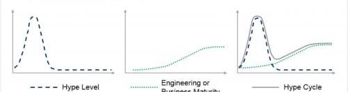 这种模式是两种力量随时间变化的函数:炒作和成熟。想象一下一个钟摆,其中炒作是使期望值上下波动的横向力,而成熟度是一种引力,最终使期望值与现实保持一致。当期望值上升得太高而无法迅速地得到满足时,摆锤会回落并且期望值会急剧下降。当成熟度较低时,期望值可能会剧烈波动,但随着成熟度的增长,期望值则会变得更加温和。