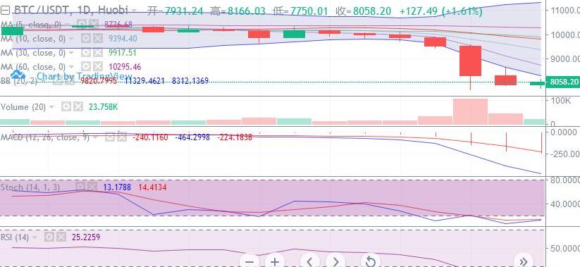 BTC日线图中,昨日的反弹一直维持至晚间,但仍然未能企稳,导致后续压力增强,多头呈溃败之势,跌势进一步形成,今日在下方底部关键支撑区域形成反弹,但仍缺乏力度,走势暂时处在8000一线调整,均线呈空头排列,布林带开口向下打开,MACD指标持续向下,跌势仍有继续蔓延的姿态,但STOCH指标在20水平线附近相交粘合,有形成金叉的迹象,一旦后续走势能在8000企稳并反弹突破至8300上方区域,则走势有望继续上攻,再度去到前期阻力压制区域,RSI指标向上,今日市场也会偏向多头一方,若短期内走势在8000企稳,则走势将会继续向上,今日也将形成一个震荡上行的趋势,但上方阻力极为强势,反弹力度缺乏,所以操作建议高空低多,在8250附近跟进空单止损带到8300位置看至8050位置,关注上方8300-8400一线阻力压制,操作中带好止盈止损,进入安全的获利节奏。