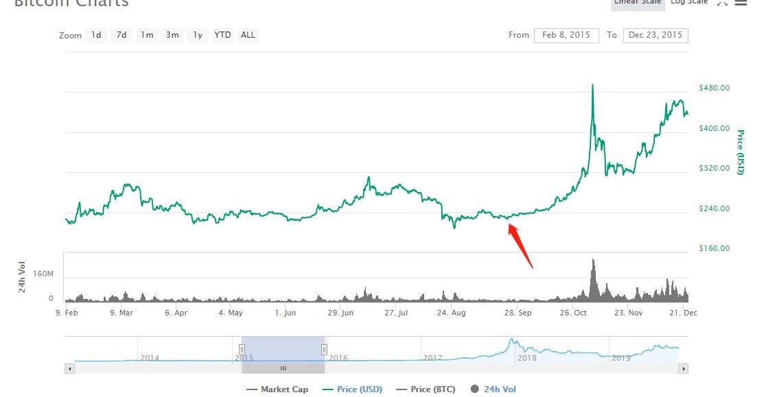 俗话说,历史不会重演,但会踩着相同的韵脚。回到比特币历史潮流中寻找江江卓尔所说的最后一跌。回顾上轮比特币减半前,即2015年K线图,如下: